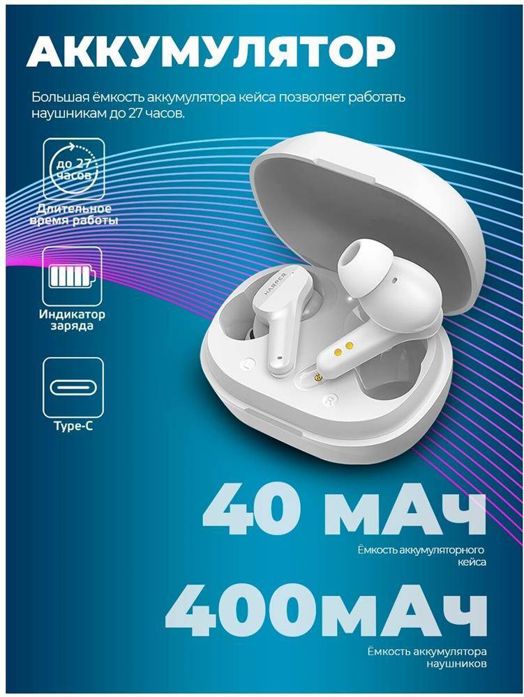 Общие характеристики: Тип устройства: беспроводные наушники; Тип наушников: внутриканальные; Частотный диапазон: 20 Гц - 20 кГц; Чуствительность: 83±3 дБ; Сопротивление: 32 Ом; Диаметр динамика: 10.6 мм. Беспроводная связь: Подключение: Bluetooth; Версия Bluetooth: 5.0; Эффективный радиус действия: до 10 м. Особенности: Встроенный микрофон; Активная система шумоподавления(ANC); Разъём для подключения: Type-C; Язык: русский; Сенсорное управление; Вызов голосового помощника; Переключение треков; Регулировка громкости; Питание: Время работы в режиме музыки/разговора: 6 ч.; Время зарядки: 1.5 ч.; Емкость аккумулятора наушников: 40 мАч.; Емкость аккумулятора кейса: 400 мАч. Корпус: Материал корпуса: пластик; Вес: 49 гр.
