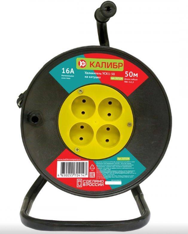 Удлинитель электрический "Калибр УСК1-50" на катушке предназначен для работы в сетях переменного тока напряжением 230±10%, ~50 Гц. При помощи удлинителя легко подключить удаленные от стационарной розетки электроприборы, имеющие шнур с плоской или круглой вилкой. Незаменим на стройке, на садовом участке, в промышленности и в быту. *в зависимости от поставки, внешний вид катушки может отличаться от представленного на фотографии. Сечение 1,5 мм2. Максимальная нагрузка 10 А, 2300 Вт. Длина кабеля 50 м.
