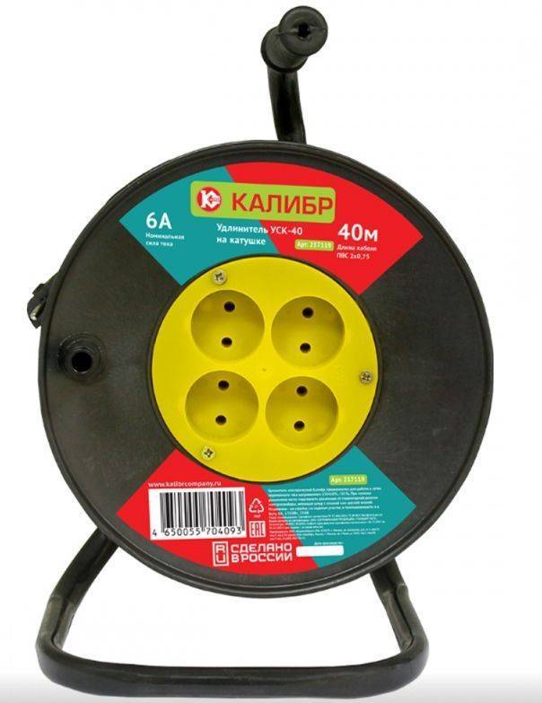 Удлинитель электрический "Калибр УСК-40" на катушке предназначен для работы в сетях переменного тока напряжением 230±10%, ~50 Гц. При помощи удлинителя легко подключить удаленные от стационарной розетки электроприборы, имеющие шнур с плоской или круглой вилкой. Незаменим на стройке, на садовом участке, в промышленности и в быту. *в зависимости от поставки, внешний вид катушки может отличаться от представленного на фотографии. Сечение 0,75 мм2. Максимальная нагрузка 6 А, 1300 Вт. Длина кабеля 40 м.