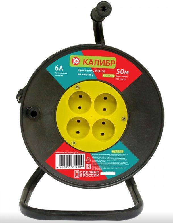 Удлинитель электрический "Калибр УСК-50" на катушке предназначен для работы в сетях переменного тока напряжением 230±10%, ~50 Гц. При помощи удлинителя легко подключить удаленные от стационарной розетки электроприборы, имеющие шнур с плоской или круглой вилкой. Незаменим на стройке, на садовом участке, в промышленности и в быту. *в зависимости от поставки, внешний вид катушки может отличаться от представленного на фотографии. Сечение 0,75 мм2. Максимальная нагрузка 6 А, 1300 Вт. Длина кабеля 50 м.