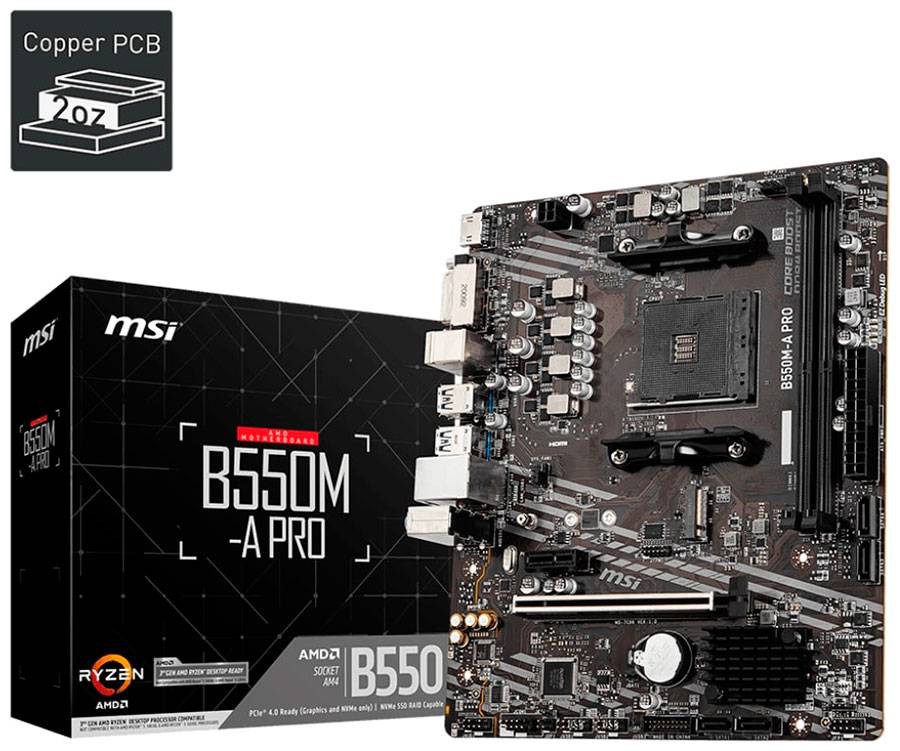 Материнская плата MSI B550M-A PRO обладает надежной элементной базой и производительными компонентами, поэтому станет хорошей основой для сборки мощного компьютера со стабильным функционированием. Данная плата выполнена в компактном форм-факторе Micro-ATX на основе чипсета AMD B550. Она поддерживает процессоры с сокетом AM4 и установку двух модулей ОЗУ объемом до 64 ГБ. В оснащение платы входят также 4 разъема SATA, 1 разъем M.2, по одному слоту расширения PCI-E x16 и PCI-E x1.