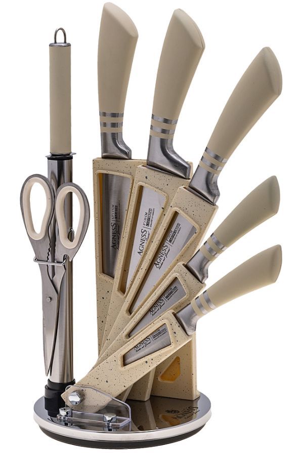 Эргономичная ручка с покрытием Soft Touch для удобной нарезки. 2-х стороняя заточка лезвия.Состав набора: Топорик 16,5см, Нож поварской 20см, Нож для нарезки 20см, Нож универсальный 12,5см, Нож для чистки овощей и фруктов, 9см, Муссат, Ножницы, Складывающаяся вращающаяся пластиковая подставка для безопасного хранения ножей.