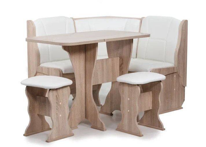 Нарцисс - комфортный кухонный уголок для малогабаритной кухни. Обе скамьи малого размера, но очень удобные, с высокой спинкой и выглядит такой кухонный диван очень солидно, не смотря на свои скромные размеры. Это недорогая и компактная мебель для любой кухни. В гарнитур входят: угловой диван, два табурета и раскладной стол. В угловой части дивана есть удобная полочка. Размеры: скамья: 1100*840*1100 мм, стол: 625(1000)*750*580 мм, табурет: 380х450х300 мм.