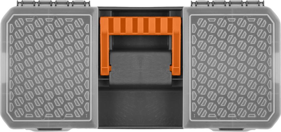 Органайзер для мелочей c двумя лотками помогает содержать в порядке, переносить на место выполнения работ и быстро находить инструменты, метизы и аксессуары. Идеален для использования дома, на даче, в гараже, мастерской, в автомобиле. Для удобства переноски органайзер и лотки скрепляются вместе с помощью защёлок. Органайзер и мелкий лоток оснащены складными ручками. Внутреннее деление на отсеки делает удобным размещение внутри органайзера и лотка деталей, которые необходимо отделить друг от друга. Подходит для хранения рыболовных и швейных принадлежностей, коллекционирования, занятия хобби.
