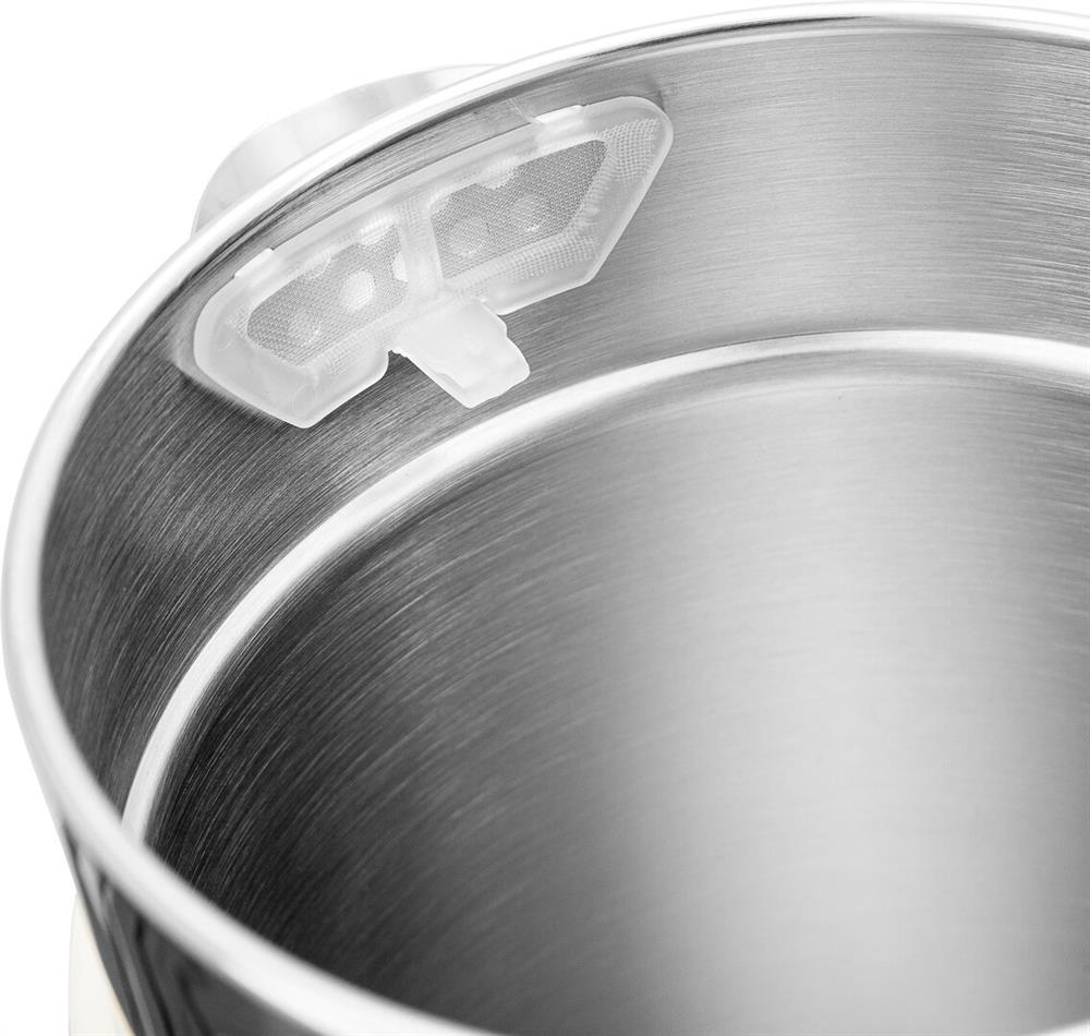 Чайник электрический. Объем: 1,5 литра. Мощность 2200 Вт. Материал корпуса: металл/пластик (2 стенки). Крышка полностью съемная. Терморегулятор. Автоотключение при отсутствии воды. Мерная шкала уровня воды.