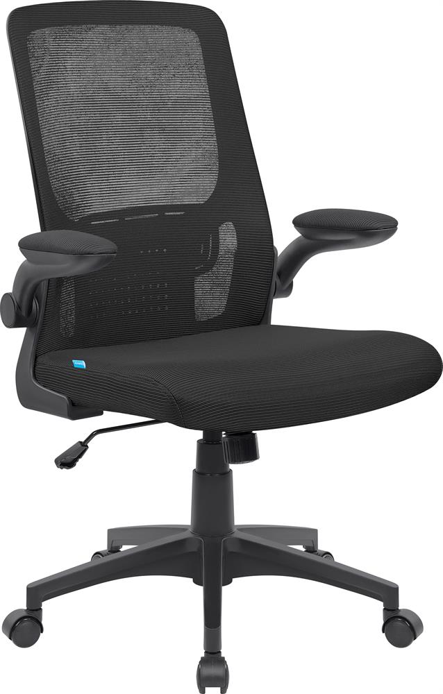 Удобное офисное кресло с мягкими подлокотниками, сетчатой спинкой и поясничным упором. Благодаря специальной конструкции подлокотники откидываются вверх. Кресло оборудовано механизмом качания.
