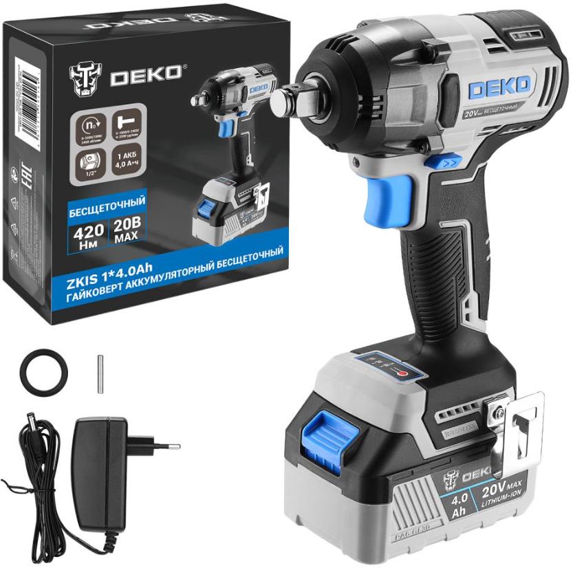 Гайковерт аккумуляторный бесщеточный ;DEKO ;ZKIS 1*4.0Ah ;предназначен для закручивания/ослабления болтов и гаек, сборки деревянных конструкций, сантехнических и общестроительных работ. Этот гайковёрт имеет 3 режима/скорости для затягивания болтов и 2 режима для ослабления болтов. Каждый режим означает разные скорости и мощности. Пользователь выбирает подходящий режим исходя из конкретных задач. Благодаря большому крутящему моменту можно выполнять тяжелые работы.Технические характеристики:Напряжение: 20 ВТип патрона: квадрат 1/2"Частота вращения: 0-1000/1800/2450 об/минЧастота ударов: 0-1800/0-2400/0-3200 уд/минМаксимальный крутящий момент: 420 НмЕмкость аккумулятора: 4000 мАчКомплектация:Гайковерт - 1 штАккумулятор - 1 штЗарядное устройство - 1 штСкоба поясная - 1 штСаморез - 1 штУплотнительное кольцо - 1 штШтифт - 1 штРуководство по эксплуатации - 1 шт