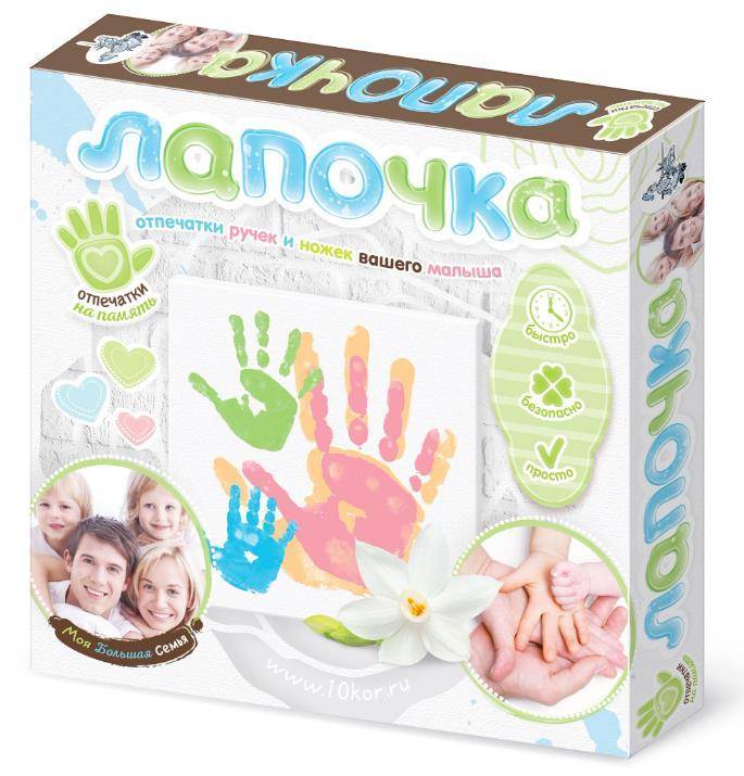 Набор "Лапочка. Отпечатки ручек и ножек вашего малыша. Моя большая семья" (пальчиковая краска). Состав: холст на подрамнике (25 х 25 см), пальчиковая краска розового, голубого, оранжевого и зелёного цвета – 4 шт. (80 мл), поролоновая губка (5 х 5 х 5 см), металлическое крепление. Материал: пальчиковая краска, холст (ткань), поролон, металл. Только для взрослых.