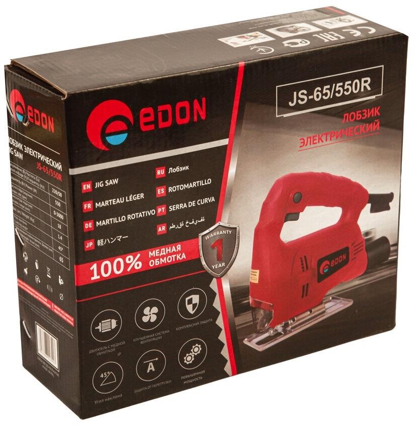 Лобзик электрический сетевой Edon JS-65/550R это инструмент с пильным металлическим полотном для узорного выпиливания. Основные характеристики: Напряжение - 220 В.; Потребляемая мощность - 550 Вт.; Частота вращения шпинделя на холостом ходу - 3000 об/мин.; Макс. глубина пропила (дерево/металл) - 65/4 мм.; Величина хода пилки - 18 мм.; Длина сетевого кабеля - 2 м.