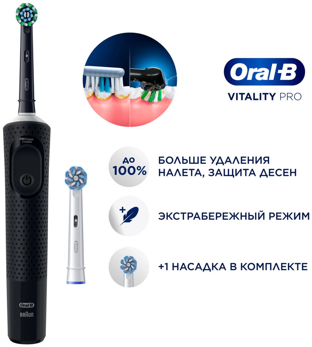 Клинически доказано, что электрическая зубнaя щеткa Oral-B Vitality PRO более эффективно очищает полость рта по сравнению с обычной зубной щеткой. Начиная с первого дня чистки. сменная насадка Cross Action удаляет гораздо больше зубного налета, чем обычная зубная щетка, делая десны более здоровыми, а вашу улыбку белоснежной благодаря удалению пигментированного зубного налета, начиная с первого дня чистки. Закругленные кончики щетинок защищают эмаль. Встроенный таймер оповестит вас о завершении 2-х минутной процедуры чистки, рекомендованной стоматологами. Новый рельефный дизайн ручки зубной щетки создает приятное комфортное ощущение в процессе чистки зубов.