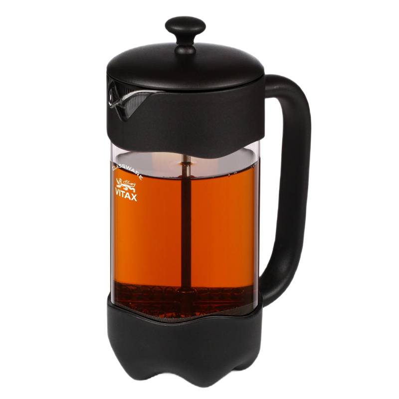 Френч-пресс Vitax New Stafford 600 мл (VX-3018). Компактный стеклянный френч-пресс для кофе и чая практичен и функционален. Его можно использовать как заварной чайник, кофейник или лимонадник. Посуда из прозрачного стекла идеально подходит для сервировки стола для дома, дачи, офиса, ресторана или чайной церемонии, для заваривания чая, кофе, трав, ягод и фруктов, приготовления лимонадов и других горячих и холодных напитков. Колба заварника изготовлена из высококачественного, жаропрочного термостойкого боросиликатного стекла, которое выдерживает воздействие высоких температур. Металлический поршень и фильтр с ситечком изготовлены из пищевой нержавейки марки 18/10. Ненагревающаяся ручка и крышка выполнены из пищевого пластика. А благодаря пластиковой подставке френч-пресс с горячим напитком можно ставить на стол, не боясь испортить поверхность. Подходит для мытья в посудомоечной машине. Объем - 600 мл. Диаметр внутренний - 8,1 см. Диаметр внешний - 8,5 см. Высота - 19,8 см. Упаковка: картонная коробка.