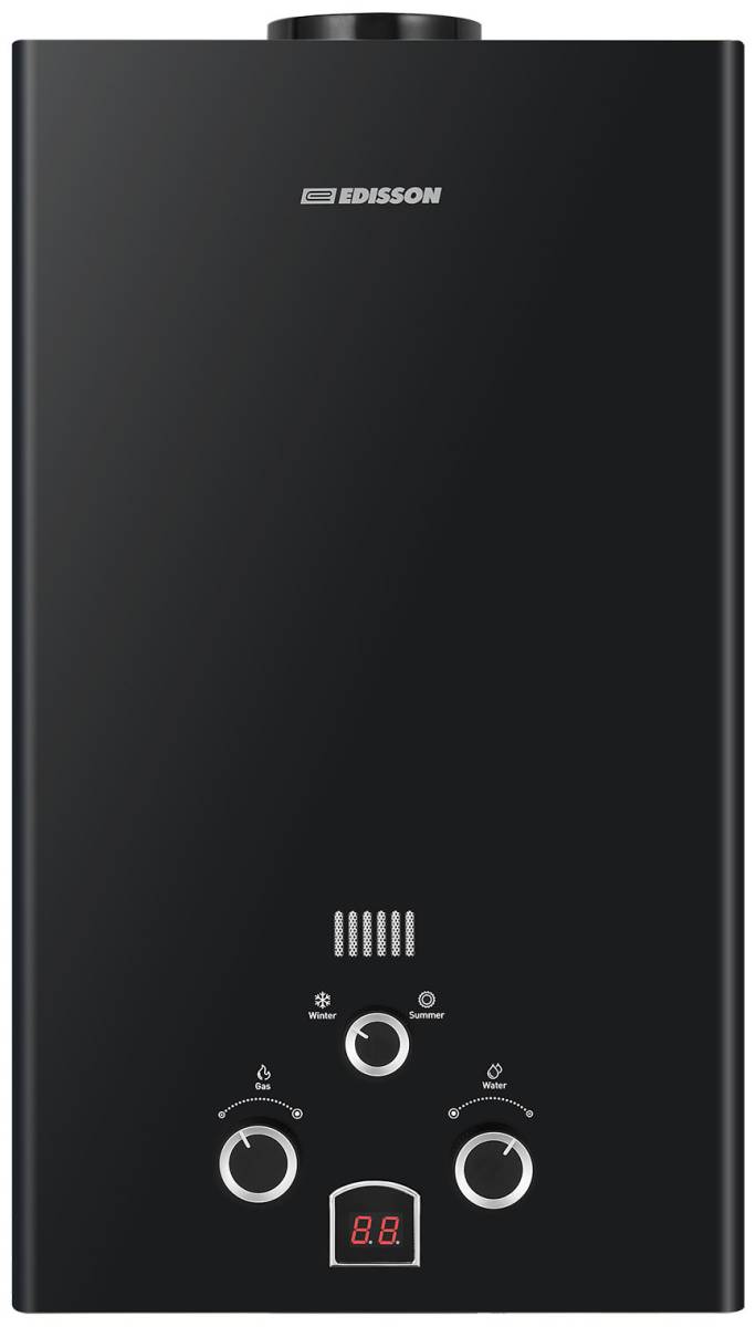 EDISSON (Эдисон) E 20 D газовая колонка нового поколения, оборудованная надежной многоступенчатой системой защиты. Модель оснащена качественным луженым теплообменником, вес которого составляет 1,9 килограмм. В системе предусмотрен датчик протока, благодаря которому прекращается подача газа, если в системе водопровода падает давление.