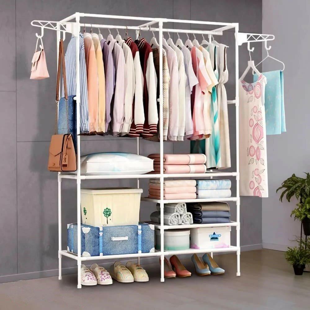 Простая и легкая двойная напольная вешалка с крючками позволит хранить все необходимые вещи рядом. Вмещает в себя большое количество вещей, позволяя грамотно вписать ее в любое пространство. Боковые вращающиеся крючки можно использовать для хранения сумок, шапок, а также мелких аксессуаров. • Размеры в сборе: 108x36x174,5 см • Материал: стальная труба O 16 мм (толщина 0,2 мм), полипропилен, нетканый материал с водоотталкивающим покрытием. • Цвет трубы: белый • Цвет ткани: серый • Количество полок: 6 • Максимальная нагрузка: 40 кг • Вес нетто: 2,35 кг • Размер индивидуальной коробки: 55x8,5x34 см • Вес брутто: 2,65 кг • Количество в коробке: 5 штук • Размер транспортной коробки: 57,5x42,5x36,5 см • Вес брутто транспортной коробки: 14,10 кг • Производитель: Helex Home • Страна: Китай