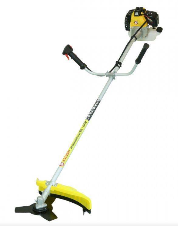 Бензиновая коса Калибр БК-2600 предназначена только для скашивания травы и подравнивания краёв газонов. ручной стартер Характеристики Двигатель: Модель двигателя 1Е40F-5, Тип двигателя 2-х тактный, Способ охлаждения воздушный принудительный, Максимальная мощность 2600 Вт/3.5 л.с, Карбюратор мембранного типа, Зажигание бесконтактное электронное, Способ запуска ручной стартер, Топливо смесь бензина АИ-92 (неэтилированного) с маслом для 2-х тактных двигателей, Тип свечи зажигания для 2-х тактных двигателей, Ёмкость топливного бака 1.2 л, Коса: Диаметр лески 2.4 мм, Максимальная ширина скашивания леской 440 мм, Диаметр режущего ножа 255 мм, Рукоятка управления J-образная, Уровень вибрации на ручках 7.5 м/с2, Давление звука 110 дБ(А)