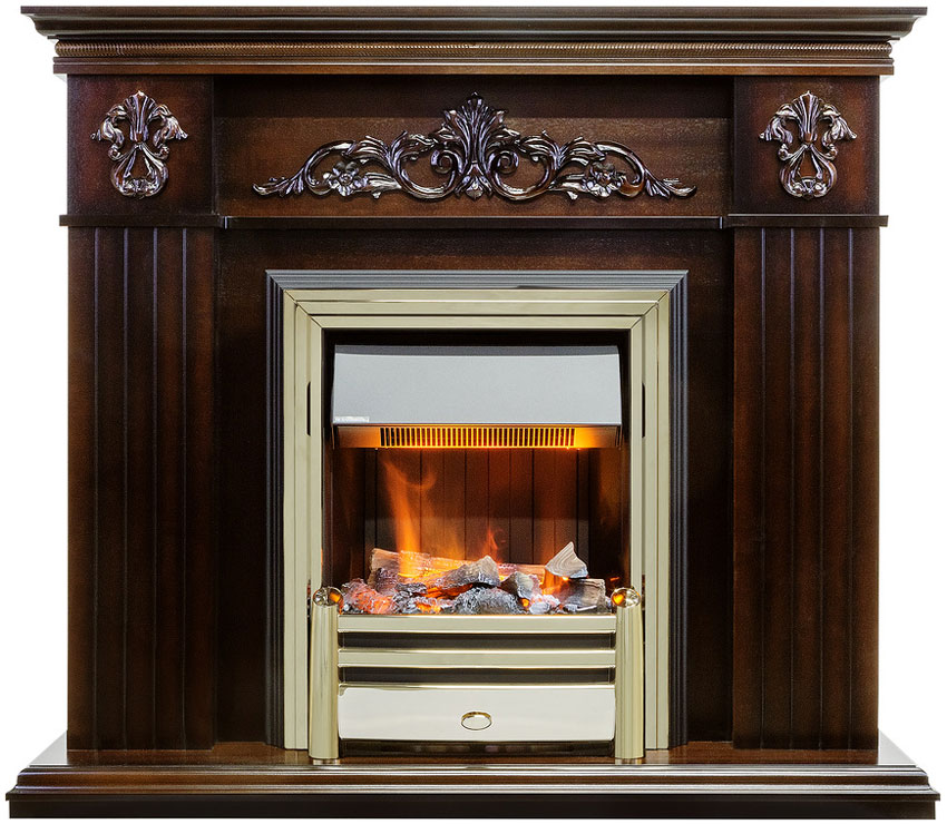 В дизайне портала зона очага немного утоплена внутрь, что придает камину более объемный вид. Верхняя панель над очагом декорирована витиеватым резным орнаментом, который смягчает строгий кабинетный стиль портала. Также этому способствует наличие резных цветочных вставок над колоннами. По колоннам протянуты вертикальные каннелюры, которые немного вытягивают камин визуально вверх. Сверху портал венчает широкая каминная крышка с декоративным карнизом. Устанавливается портал на небольшой постамент, который приподнимает его над полом.