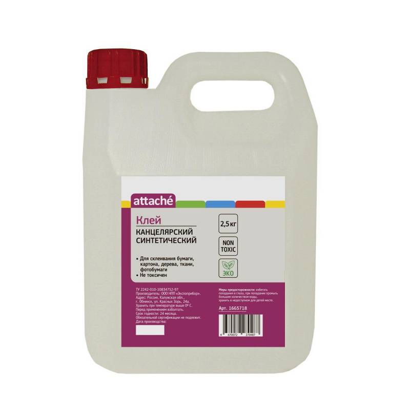 Синтетический канцелярский клей Attache 2,5 кг. Морозостойкий, прозрачный, высокого качества. Предназначен для офисных канцелярских работ по бумаге и картону, а также для приклеивания фотографий. Клей нетоксичен, не содержит растворителей. Способ применения: поверхность перед склеиванием должна быть сухой, без загрязнений. Клей равномерно нанести на склеиваемые поверхности, соединить и прижать. Соединение оставить в сжатом состоянии не менее двух часов. Максимальный эффект достигается путем плотного сжатия склеиваемых поверхностей до полного высыхания. Время полного высыхания - около 24 часов при температуре 20 °С и относительной влажности воздуха 65%.