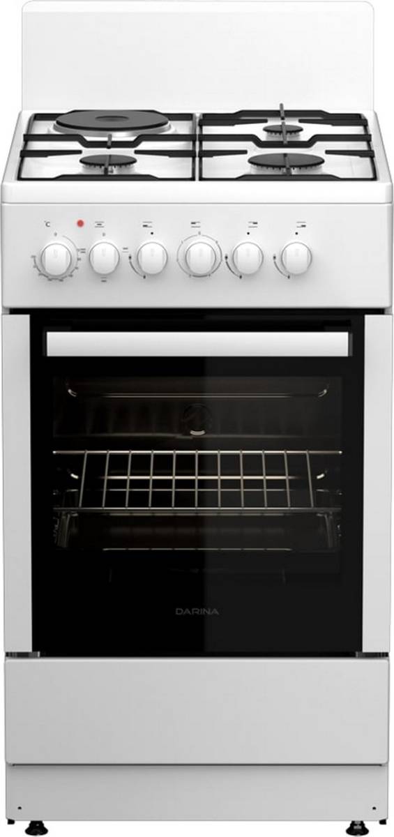 Комбинированная плита DARINA 1E KM 241 321 W белого цвета, с поворотными ручками управления. Плита оснащена подсветкой духовки, удобным хозяйственным
