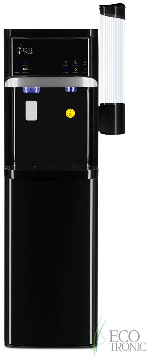 Напольный кулер с ледогенератором, с нижней загрузкой и компрессорным охлаждением, в черном глянцевом корпусе с вставкой из нержавеющей стали. Ледогенератор позволяет получить кубики льда, за час примерно 560 г. Для подачи льда используется нажим кружкой, для подачи воды - кнопки на сенсорной панели управления (подача воды, включение режима нагрева и охлаждения, запуск работы ледогенератора). Три режима охлаждения: супер-охлаждение воды без включения ледогенератора (3 л/ч), с ледогенератором 0,5 л/ч, с полным отсеком для льда 2 л/ч. Бак горячей воды из нержавеющей стали, с внутренним спиральным нагревателем. Автоматическое отключение воды при наборе 1,2 л горячей воды и 1,6 л холодной воды. Система энергосбережения отключает нагрев после отключения освещения, охлаждение воды и ледогенератор при этом не отключаются.