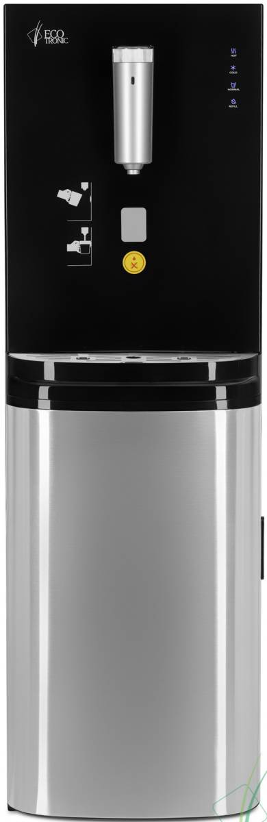 Уникальный кулер напольного типа с нижней загрузкой и электронным охлаждением, в котором управление реализовано с помощью кран-блока управления. Предусмотрена UV лампа для дезинфекции и сохранения воды в аппарате как можно дольше свежей. Обработка UV-лампой происходит в течение 5 мин, каждые 30 мин. Стильный дизайн с одним краном подачи воды (горячей воды, холодной воды или воды комнатной температуры). Выбор режима подачи воды поворотом, включение с помощью нажима кружкой. Защита от случайной подачи горячей воды, снимается касанием сенсорной кнопки. Индикация в случае необходимости замены бутыли. Корпус черного цвета со вставками из нержавеющей стали.