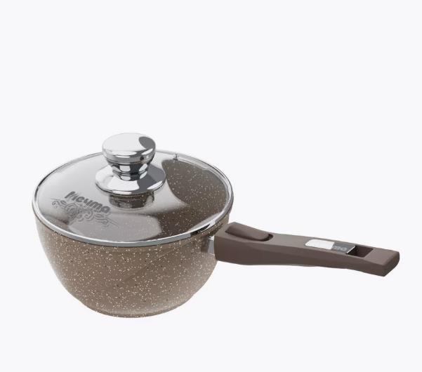 Ковш 1.7л со съемной ручкой из бакелита и стеклянной крышкой. Антипригарное покрытие Greblon Rough на водной основе без PFOA. Серия "Гранит brown". Подходит для всех типов плит, кроме индукционных. Можно использовать в посудомоечной машине. Ресурс более 15 000 циклов, толщина покрытия до 55 мкр. Толщина дна 5,5-6мм., толщина стенок 3,6-4мм. Покрытие Greblon Rough позволяет готовить с минимальным количеством масла, сохраняя вкусовые и полезные свойства продуктов. Литой толстостенный корпус не подвержен деформации, а утолщенное дно равномерно распределяет тепло по всей поверхности.