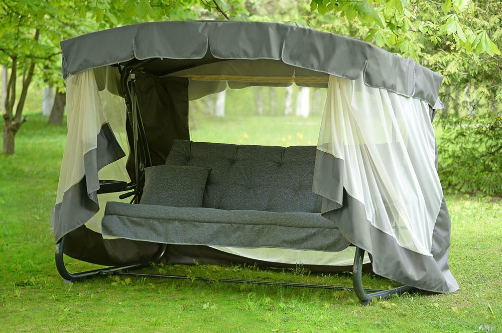 Габаритные размеры изделия (длина х ширина х высота), мм: 2665х1440х1860.Максимальная нагрузка, кг: 320. Каркас: труба стальная O60х1,5мм, полимерное покрытие, полка - 2 шт. Основание сиденья - сетка металлическая. Мягкий элемент: ткань 100% полиэстер (рогожка), плотность 220-230г/м2, наполнитель мягкого элемента поролон листовой 80 мм + синтепон (обшая толщина 100мм), 2 подушки. Декор сиденья и спинки "тафтинг". Тент: кондер с в/о пропиткой плотность 280г/м2, с противомоскитной сеткой (полотно гардинное основовязаное 100% п/э плотность 39г/м2) Регулировка спинки: рычаг трансформации с возможностью фиксации в горизонтальном положении.