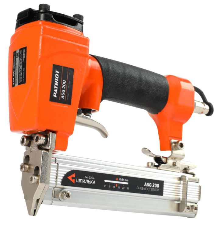 Шпилькозабивной пневмопистолет Patriot ASG 200 применяется для соединения различных элементов во время монтажных или строительных работ. Емкость магазина (скоб/гвоздей), шт 100. Скоба Тип 23 (23GA), длина 12-25 мм, сечение 0,64 мм. Тип соединения быстросъем. Присоединительный штуцер, дюйм 1/4 быстросъем RAPID. Рабочее давление, бар 4-7. Расход воздуха, л/мин 23.