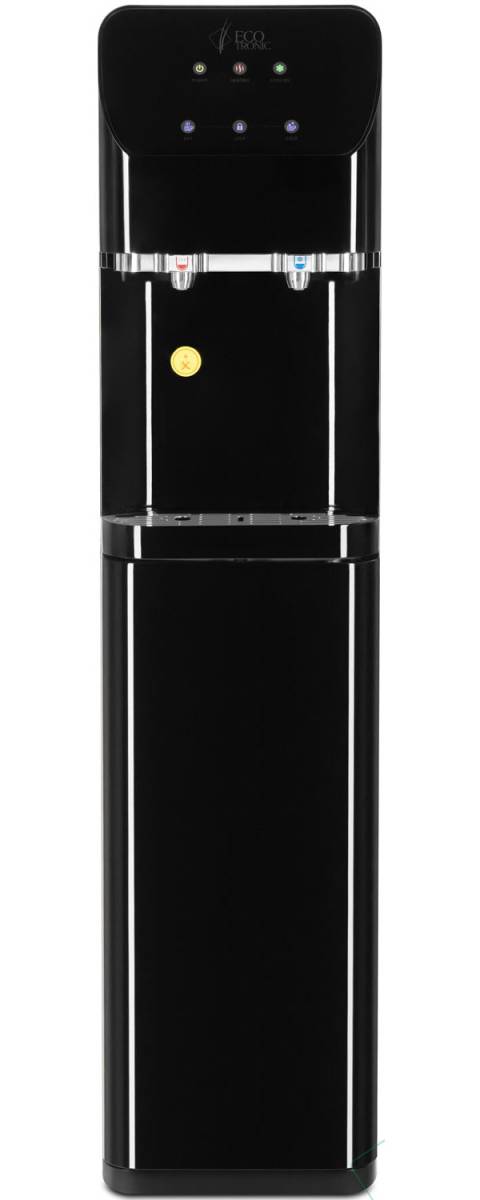 Пурифайер напольного типа с ультрафильтрационной системой очистки воды. Сенсорная панель управления с защитой от случайной подачи горячей воды. Подача воды останавливается повторным нажатием, либо подается порционно: 1 л горячей воды при однократном нажатии, 1.5 л холодной воды при однократном нажатии. Большая производительность и вместительные баки холодной и горячей воды. Мощность нагревательного элемента 550 Вт. Индикация работы пурифайера, нагрева и охлаждения воды. Корпус черного цвета с хромированными деталями: решеткой лотка и вставками на передней панели.