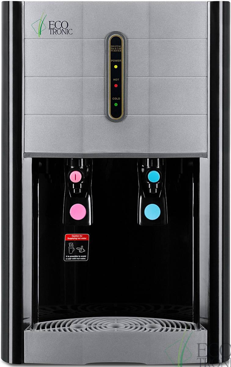 Настольный пурифайер с 4-х ступенчатой RO фильтрацией. Высота 522 мм, бак горячей воды 1,4л., бак холодной воды 4л. Краны кнопки с защитой от детей. Цвет - черный с серебряной вставкой на лицевой панели. Бесшумный компрессор LG.