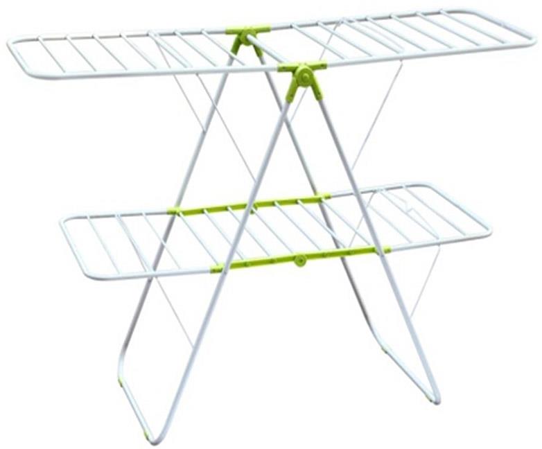 Сушилка для белья напольная, двухуровневая Размер: 147*60*98 см. Размер в сложенном виде: 105*60*9,5 см. Диаметр прутьев: 6/9 мм. Диаметр трубок каркаса: 16 мм. Максимальная рабочая длина: 19 м. Максимальная нагрузка: 25 кг. Материал: окрашенный металл, пластмасса. Металлические прутья увеличенной толщины (диаметр 6/9 мм) не прогибаются, позволяют сушить белье без заломов, ускоряя сушку за счет лучшей вентиляции. Простой механизм складывания. Компактна в сложенном виде. Пластиковые накладки на опорах для устойчивости и защиты напольного покрытия.