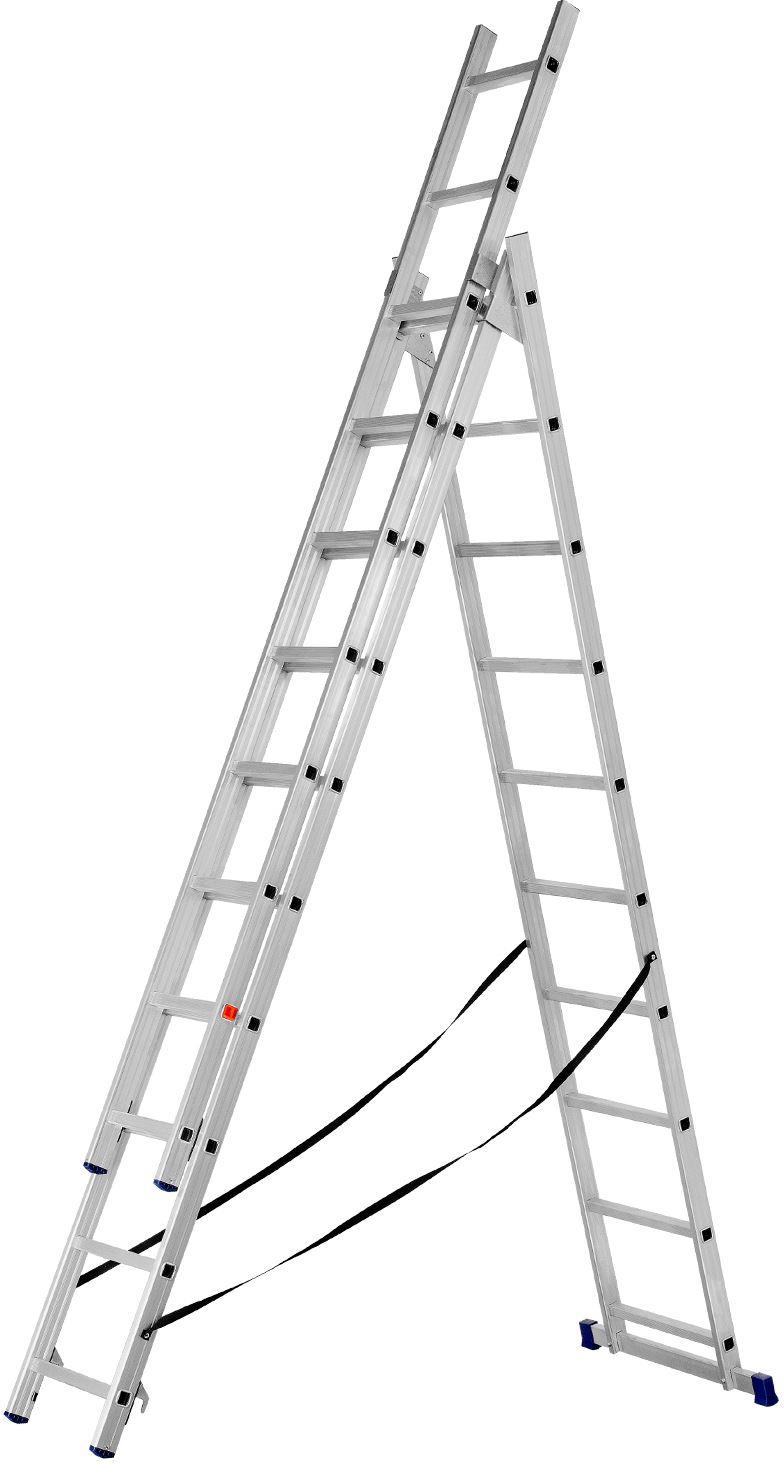 Алюминиевая трехсекционная лестница Сибртех 97820 состоит из 3-х секций по 10 ступеней каждая. Она предназначена для использования преимущественно на открытом воздухе и в помещениях с высокими потолками, подойдет также для работников коммунальных служб и строителей. Лестница поможет провести отделочные, монтажные работы, будет полезна на складе.ПреимуществаНадежность и долговечность — рама изготовлена из прессованного алюминиевого профиля прямоугольного сечения, весит намного меньше стальных аналогов, при этом обладает прочностью и коррозионной стойкостью.Допустимая нагрузка 150 кг — лестница способна выдержать вес практически любого пользователя.Многофункциональность — лестница может использоваться в 3-х различных вариациях — в качестве стремянки (с двумя расставленными и одной выдвинутой вверх секцией), двухсторонней стремянки (две секции расставлены, третья демонтирована) и приставной лестницы.Пластиковые заглушки — края профиля не царапают напольное покрытие независимо от выбранного положения лестницы.Устойчивость — лестница оснащена съемным стабилизатором, выравнивающим ее положение на горизонтальных поверхностях.Безопасная эксплуатация — на ступени нанесено антискользящее покрытие, имеется ограничитель по максимальной высоте.Простое применение — сборка, разборка и смена рабочих положений не занимает много времени.Компактное хранение и удобная транспортировка — в сложенном виде лестница не занимает много места.