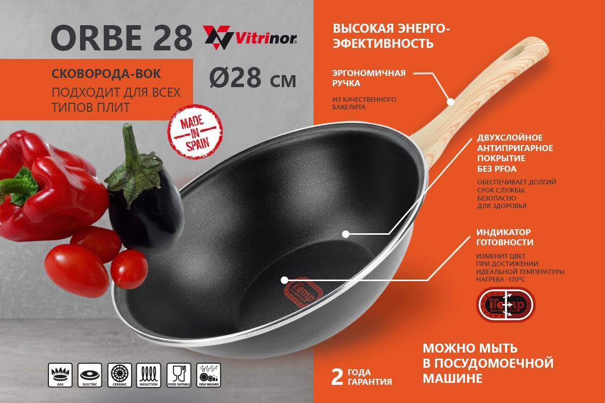 Корпус сковороды-вок Vitrinor ORBE 28 изготовлен из стали с ферромагнитными свойствами, что обеспечивает быстрый нагрев и высокую энергоэффективность, особенно при использовании продукции Vitrinor на электрических плитах. Устанавливайте меньшую мощность нагрева на своей плите для достижения лучших результатов и экономии электроэнергии.