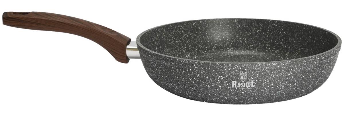 Сковороды ТМ RASHEL выполнены из высококачественного пищевого алюминия. Внутреннее и внешнее сверхпрочное, гранитное, антипригарное покрытие ТИТАНГРАНИТ.