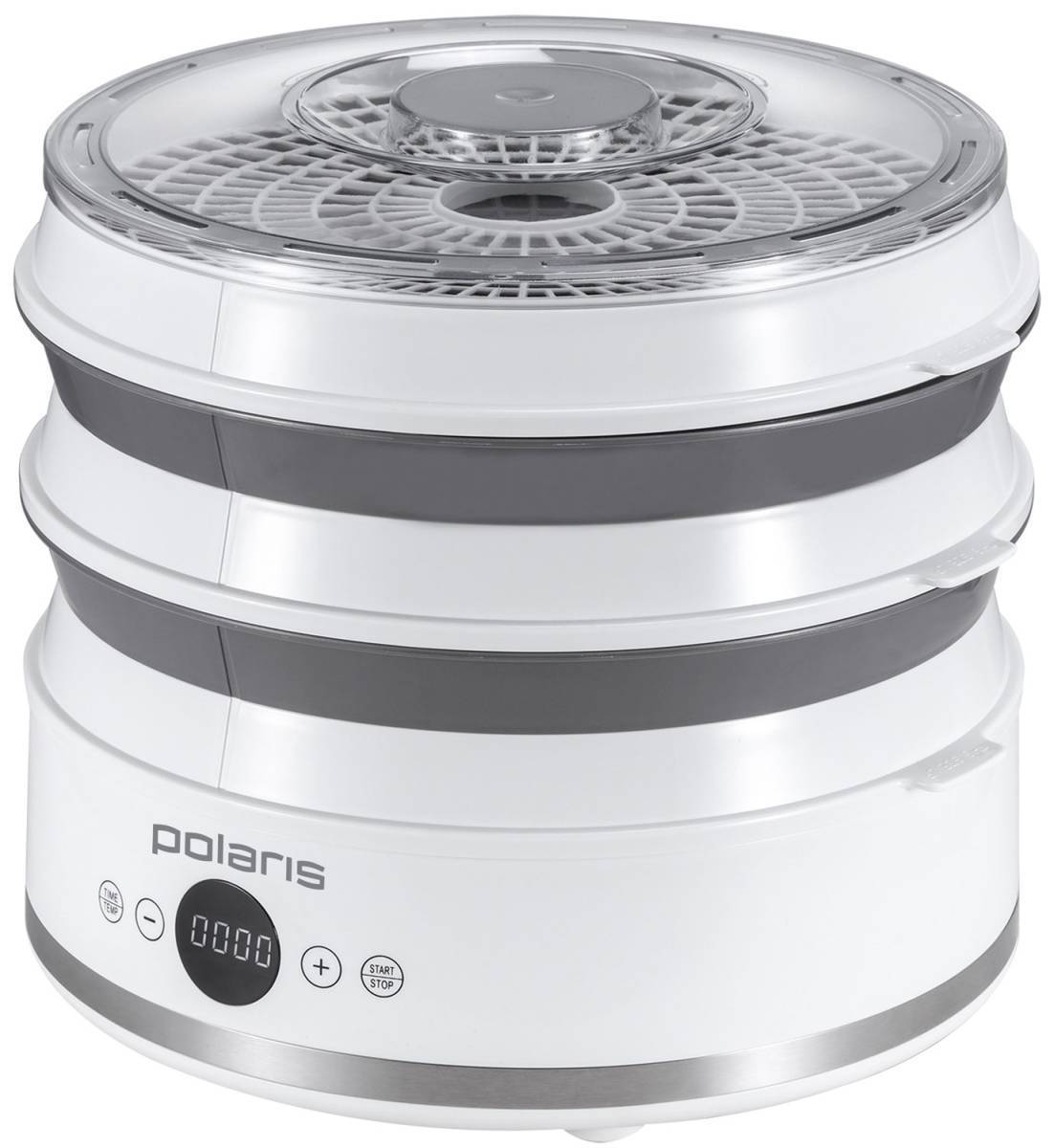 Сушилка для овощей и фруктов Polaris PFD 2808V в белом корпусе из пластика состоит из 5 складных поддонов, которые позволяют сэкономить пространство при хранении