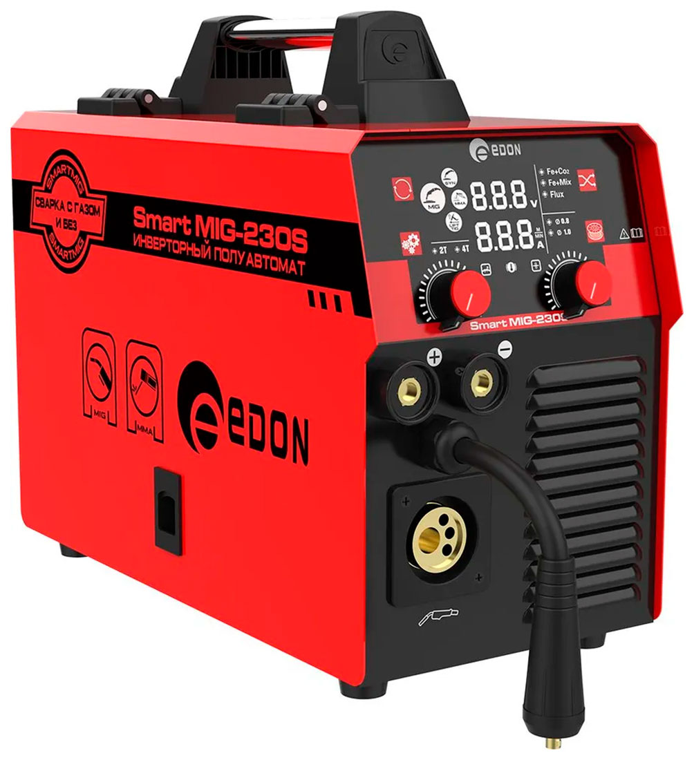 Инверторный сварочный аппарат Edon Smart MIG-230S - это современный и надежный цифровой аппарат, обеспечивающий высокое качество сварных швов и используемый для сварки различных типов металлов. Предназначен для полуавтоматической сварки в среде защитных газов (MIG/MAG), безгазовой сварки самозащитной (порошковой) проволокой (FCAW), дуговой сварки штучным электродом (MMA) и LIFT-TIG сварки, то есть сварочный аппарат является универсальным.