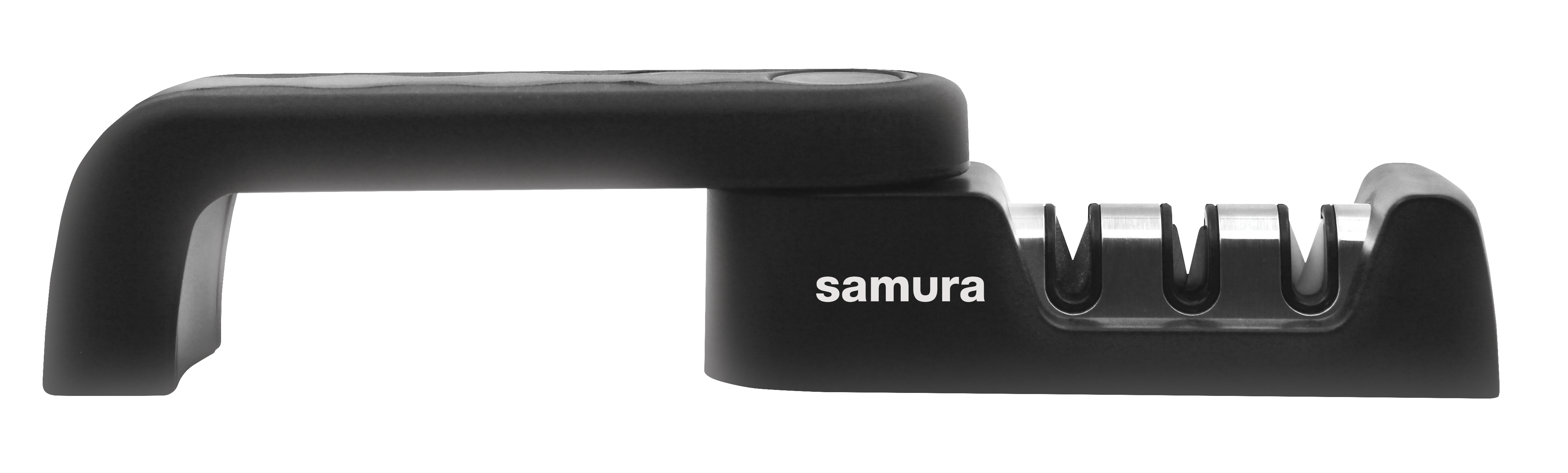 Samura KSS-3200 — та самая маленькая точилка, которая быстро становится «дежурной» на кухне. Положили на стол — и она сразу ощущается устойчивой: корпус не ёрзает, в руке — понятный хват, без лишних деталей. Нажимаете кнопку, поворачиваете ручку — и слышите короткий спокойный щелчок: точилка готова к работе.