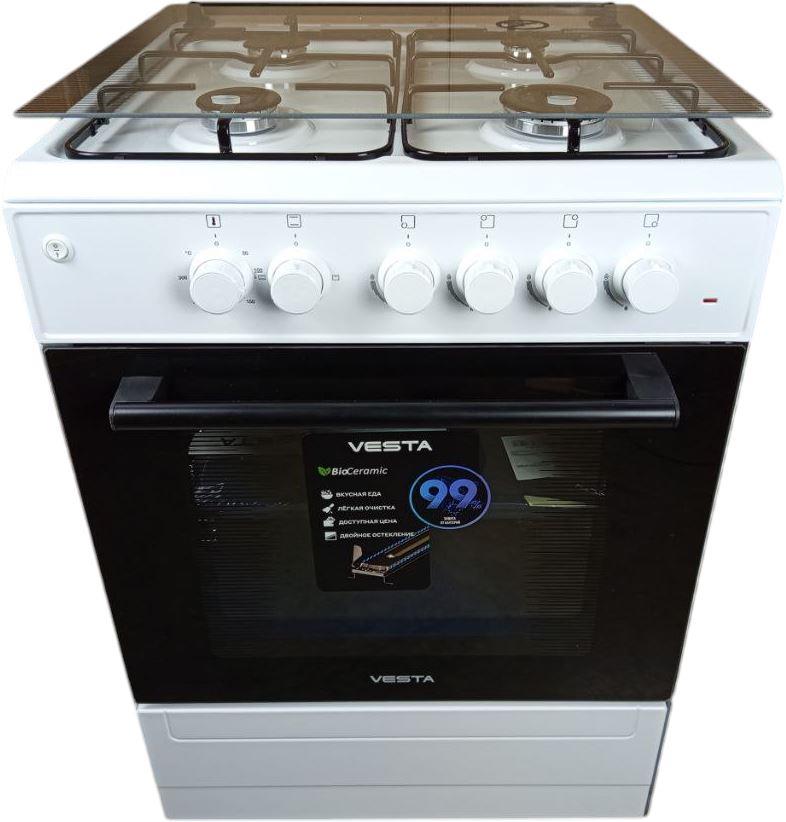 Габариты, ВхШхГ: 85х60х60; Цвет: белый; Горелки стола: Газовые – 4 шт.; Газконтроль рабочей поверхности; Мощность горелок рабочего стола: Горелка передняя левая/правая – 2,0/2,4 кВт.; Горелка задняя левая/правая – 2,0/1,0 кВт.; Электрический духовой шкаф; Объем духовки: 65 л.; Верхний/нижний нагреватель духовки: тен; Решетка рабочего стола: сталь. Крышка рабочего стола: стекло; Термометр духовки; Кнопка электророзжига горелок стола; Электрическая подсветка духовки; Противень: 2 шт.
