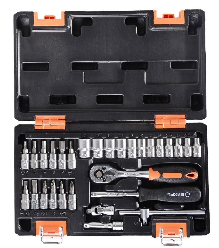 Набор инструментов ВИХРЬ, 1/4", 29 предм, кейс. Ключ трещоточный 1/4"" CRV, PP+TPR. Кардан 1/4"" CrV. Удлинитель 1/4"" 50 мм CrV. Отвертка-держатель 1/4"" CrV. Вороток Т-образный 1/4"" CrV. Головки торцевые CrV 1/4"" 4, 4.5, 5, 5.5, 6, 7, 8, 9, 10, 11, 12, 13; со вставкой H3, H4, H5, H6, H8 SL4, SL5.5, SL7, PH1, PH2, PZ1, PZ2.