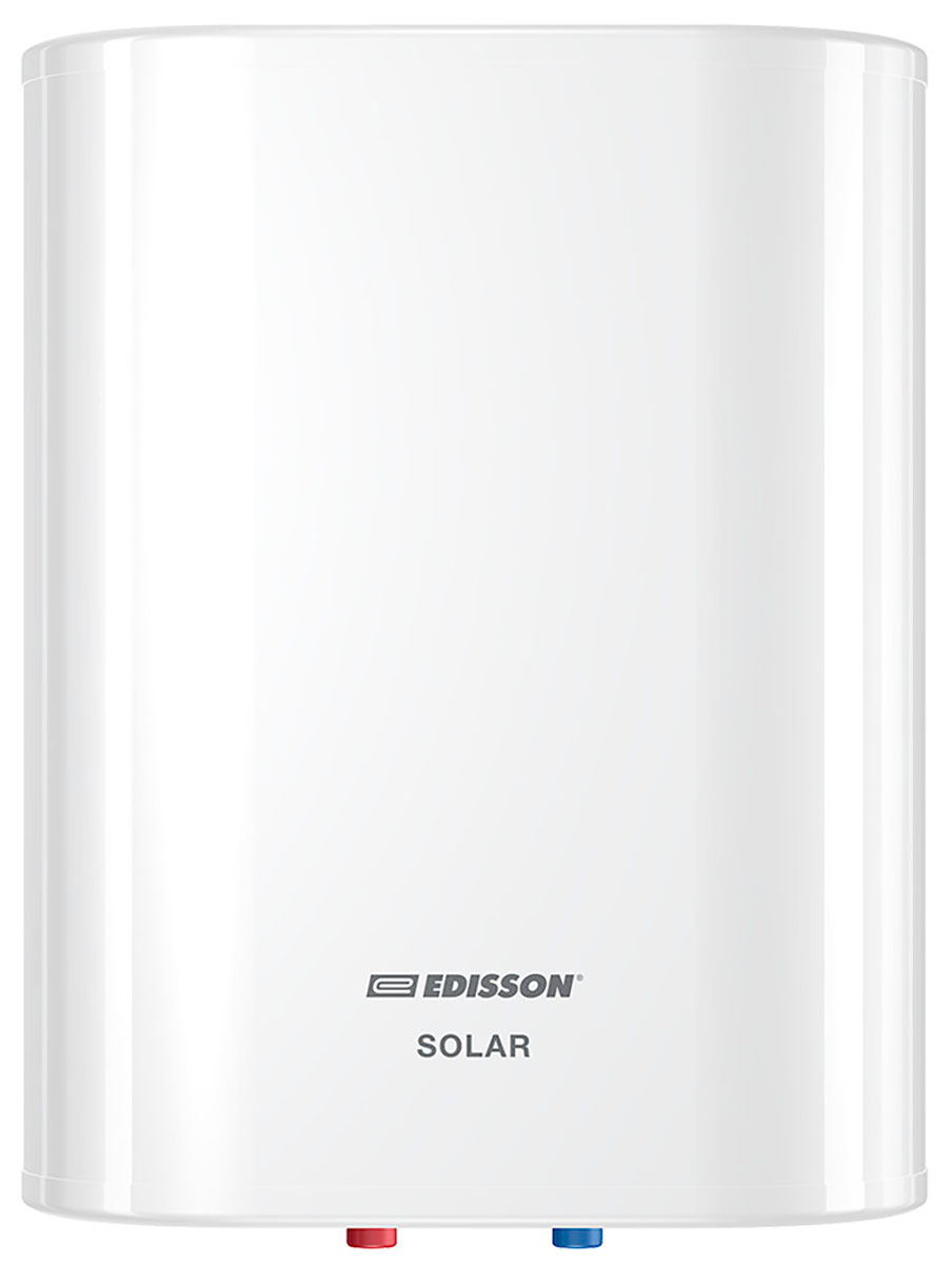Электрический водонагреватель Edisson Solar 30 V имеет объем 30 литров. Он имеет лаконичный белый цвет, благодаря чему его можно установить в любом интерьере. Он может быть установлен вертикально. Устройство имеет плоскую прямоугольную форму и внутреннее покрытие из нержавеющей стали, что защищает его от коррозии. Водонагреватель может нагревать воду до 75 градусов благодаря мощности 2 кВт. Благодаря функции ускоренного нагрева, время, требующееся на подогрев воды, уменьшается.