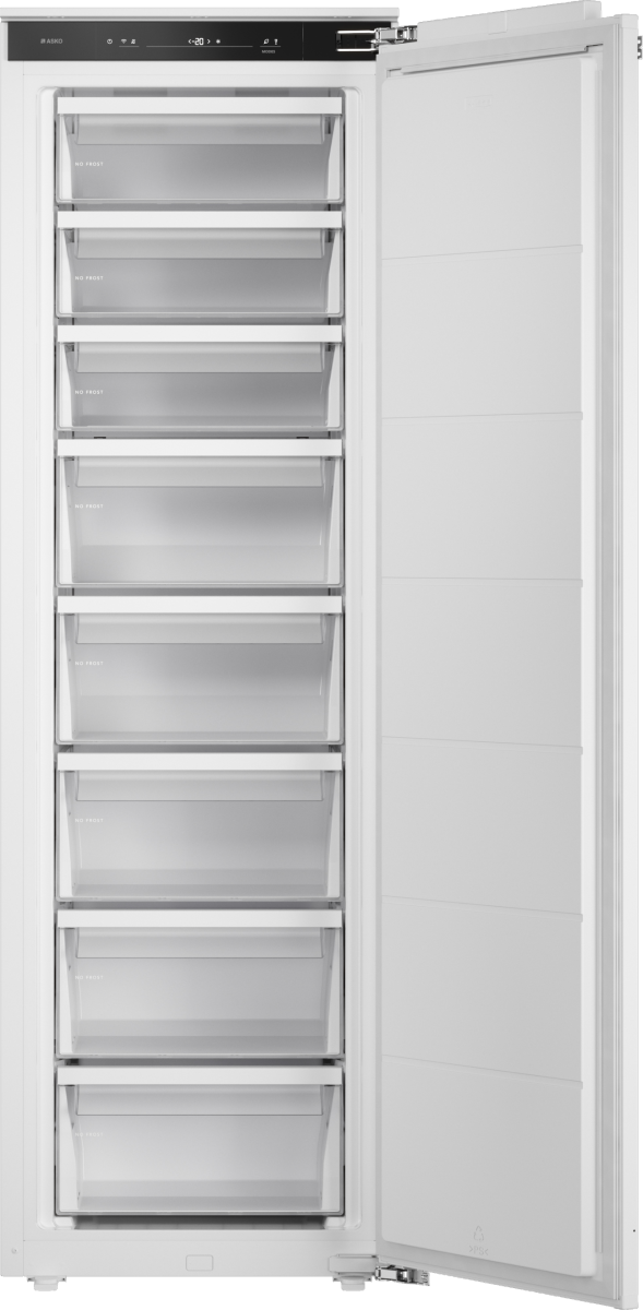 Модель ASKO RBF276DND1 выполнена в нейтральном белом цвете, что позволяет ей незаметно вписываться в любой кухонный гарнитур. При встраивании в нишу она создаёт единый визуальный ансамбль с фасадами, не нарушая общей эстетики. Габариты корпуса — 174.5 см в высоту и 54.6 см в глубину — рассчитаны под стандартный проём размером 177,5-178 × 56-57 × 56 см, обеспечивая плотную и аккуратную установку. Благодаря системе Door-on-Door вы можете закрепить родную дверцу кухонного шкафа прямо на морозильник, сохранив стилистическое единство. Дверь по умолчанию открывается справа, что удобно при типовой планировке. Вес — 74 кг, а упаковочные размеры продуманы так, чтобы монтаж прошёл без лишних сложностей даже в тесном пространстве.