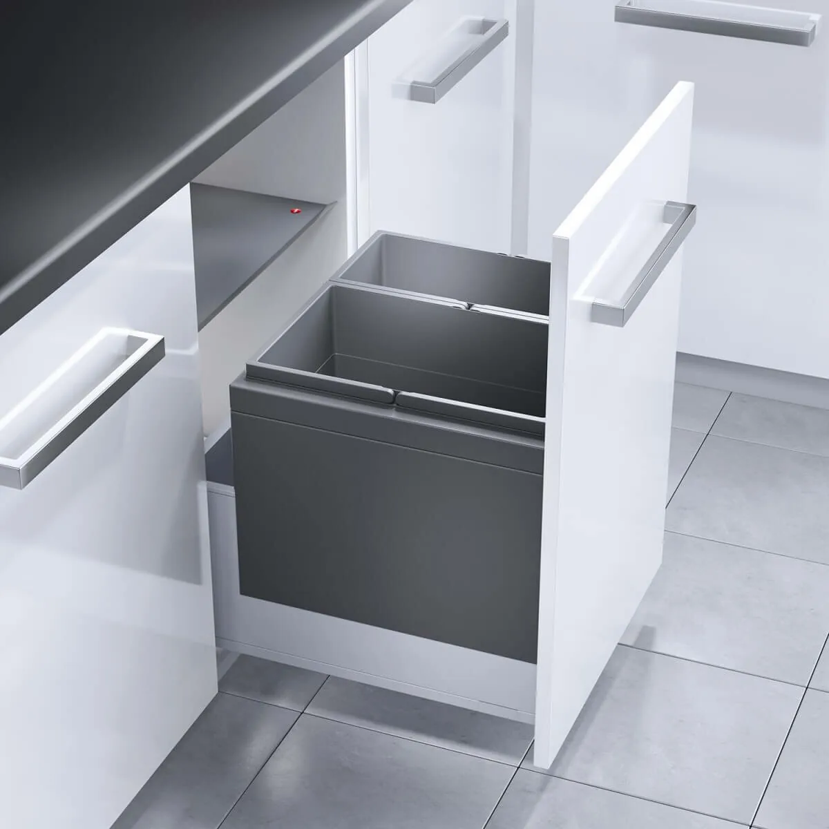 Система сортировки мусора выполнена в модном цвете "графит". Устанавливается в готовый выдвижной шкаф. Легкий монтаж на 4 шурупа ко дну шкафа и на 2 шурупа - к мебельному фасаду. Подходит для стандартных кухонных шкафов всех известных производителей.