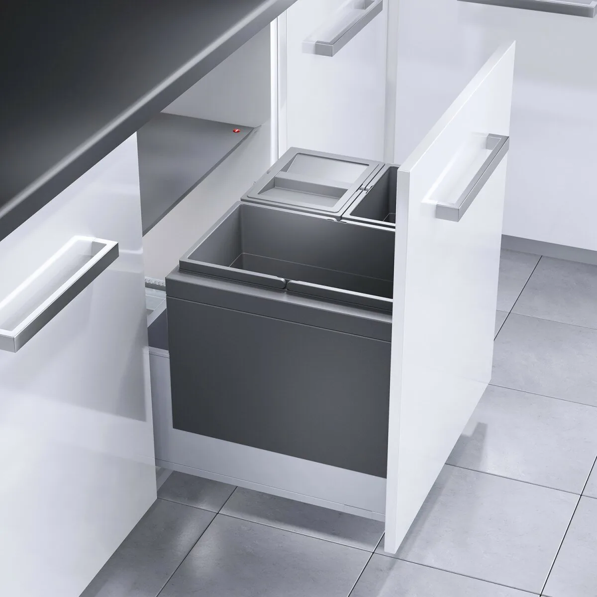 Система сортировки мусора выполнена в модном цвете "графит". Устанавливается в готовый выдвижной шкаф. Легкий монтаж на 4 шурупа ко дну шкафа и на 2 шурупа - к мебельному фасаду. Подходит для стандартных кухонных шкафов всех известных производителей.