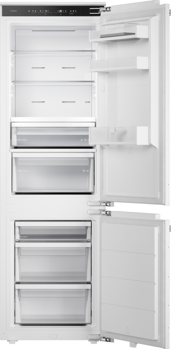 Компактный встраиваемый холодильник ASKO RBC276DNC1 выполнена в светлом, сдержанном тоне, который органично вливается в любой кухонный ансамбль, не выделяясь, но и не теряясь. Её размеры — 177,2 × 55,7 × 54,5 см — подобраны под стандартную нишу 177,5-178 × 56-57 × 56 см, что обеспечивает плотную и аккуратную встройку. Благодаря системе Door-on-Door вы можете закрепить родную дверцу кухонного шкафа прямо на корпус — получается единая поверхность без визуальных разрывов. Дверь по умолчанию открывается справа, но при необходимости её легко перенавесить под вашу планировку.