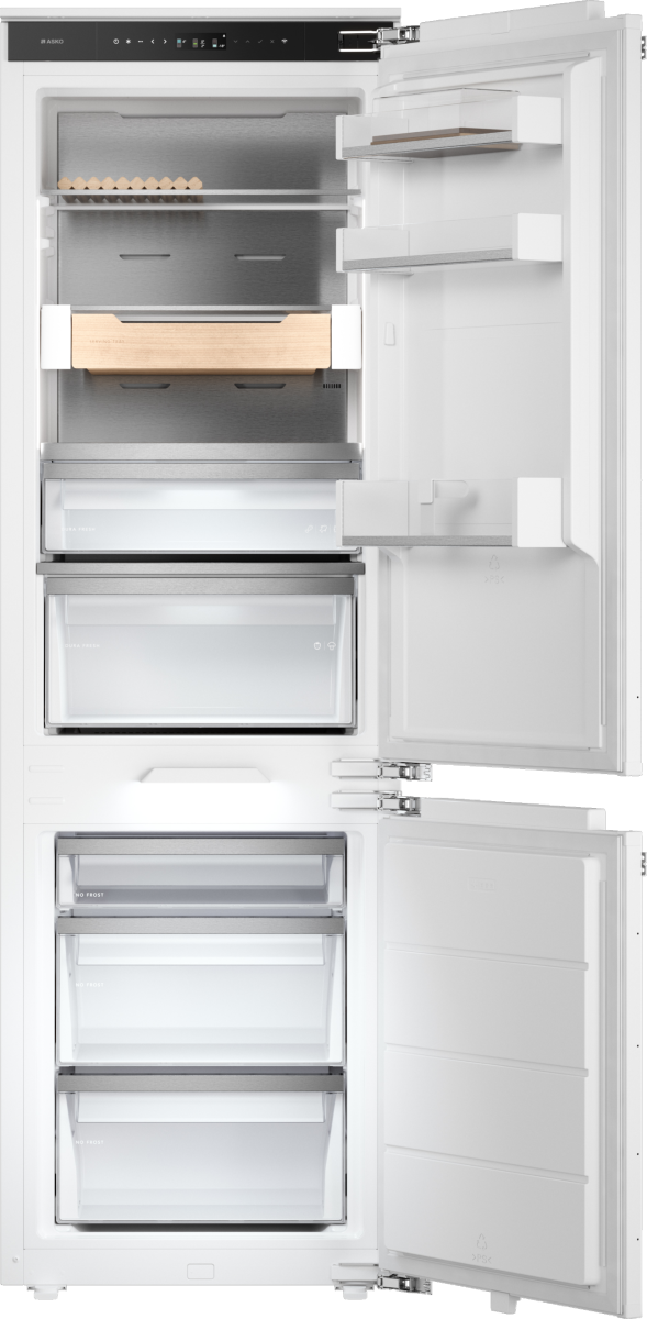 Технология Total NoFrost полностью исключает образование инея, избавляя от необходимости ручной разморозки. Система Opti Flow+ обеспечивает равномерное распределение холода по всему объему, а инновационная функция DuraFresh поддерживает оптимальный уровень влажности в ящике для овощей и фруктов, заметно продлевая их свежесть. Управление осуществляется через сенсорную панель с дисплеем: здесь доступны такие режимы, как Super Cool для быстрого охлаждения напитков и Fast Freeze — для моментальной заморозки свежих продуктов. Дополнительные плюсы: автоматическое оттаивание, энергоэффективная LED-подсветка и конструкция Door-on-Door, упрощающая встраивание в стандартную кухонную нишу. В комплекте идёт кабель длиной 3 метра.